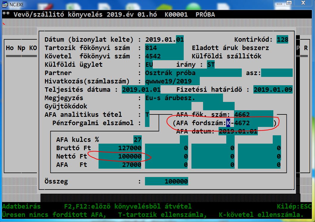 A részleteket és a működés leirását az EUSELV.TXT és az EUSKODOK.TXT leirás tartalmazza. EU-s beszerzések (termék-ST és szolgáltatás-SS) könyvelésének eltérő módja (itt a könyvelésben már nem csak az alapot irjuk be), hanem a beérkező számlához hozzákönyveljük a számított Áfáját is, de mind a visszaigényelhető (4662), mind a befizetendő (4672) oldalon. Ahhoz, hogy ezt ne kelljen kézzel tételesen egyesével könyvelnünk, a vevö/szállitó könyvelés kiegészült az eddigi AFA T/K és fökönyvi száma rovat mellett, az ellenoldalra könyvelendő AFa tételt megadó T/K és főkönyvi szám rovattal. Vagyis ekkor a vevő/szállitóban beirt tétel lekönyvelésekor rögtön automatikusan előállítódik a könyvben a megszokott módon 1. az Alapot tartalmazó tétel, 2. az Áfa tétele, valamint egy 3. újabb Áfa tétele is (de ez már az un.forditott ellenoldali könyveléssel). Igy ha listázunk, kartont gyüjtünk, akkor ezek az EU-s beszerzések a 4662 és 4672 számokon is megjelennek, hiszen könyvelten a könyvünkben is megjelennek (már nem csak az Áfa bevallás készitésénél számitódik ki a könyvelt alap Ft-ból). A bekönyvelt tételnél a számla összeget a Nettó Ft adatba irjuk be, ne ijedjünk meg, hogy bruttósitja a tartozást, hiszen + és - Áfa kiegyenliti egymást és csak az alap összeg marad a pénztár/bank kiegyenlités követéséhez. Fontos, hogy ellenőrizzük le az általános beállítási paramétereket, hogy a vevö számlaszám, Afa számok (és persze a többi is) helyesen meg legyenek adva. A kódbeállításoknál a vevö/szállitói kontirkódok beállításának megjelenitése megváltozott, hogy az ellen Áfa adat is kiférjen a képernyőre (már nem fért el egy sorban). Ezt az új ellenÁfa számot (T/K-t) csak ezen EU-s beszerzések automata kontirkódoknál kell kitöltenünk. |